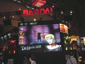 | ブースの大きさが際だっていたバンダイ。出展ソフト数も膨大で、期待の「ガンダム」やWSカラーのコーナーは人の列が絶えることはなかった。また、巨大スクリーンやゲーム大会用のステージを設け、体験版や記念品を配布するなど、力の入れ具合はハンパじゃない!? |