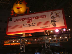 4,5.銀世界を舞台に、スキーヤーとなってゲレンデを疾走する『アルペンレーサー3』。ブースには、大画面が用意されており、迫力あるプレイが楽しめた。