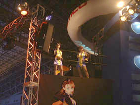 13,14.メインモニターの両脇には、『ゼノサーガ〜』の登場人物、シオン・ウヅキのコスチュームを着たコンパニオンの姿が。立っている場所が場所だけに、男性客は目のやり場に困っていた。さすがに、真下から撮るわけには行かないので、フロアに立っていたお姉様を撮らせていただきました。
