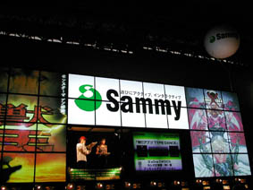 | 人気2D格闘ゲーム「ギルティギア」の巨大看板がすぐに目についたサミーのブース。中央のステージではパチスロや「ギルティギア」の大会なども開催された。PS2版の新作「ギルティギア ゼクス Plus」の試遊台も設置され、ブース付近には常に大きな人だかりが出来ていた。 |