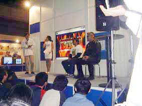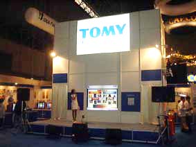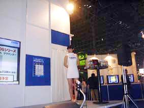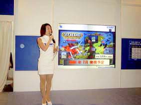 1,2.コンパニオンによる新作『ZOID』シリーズの紹介シーン。巨大モニターに写し出された映像は迫力満点だ。